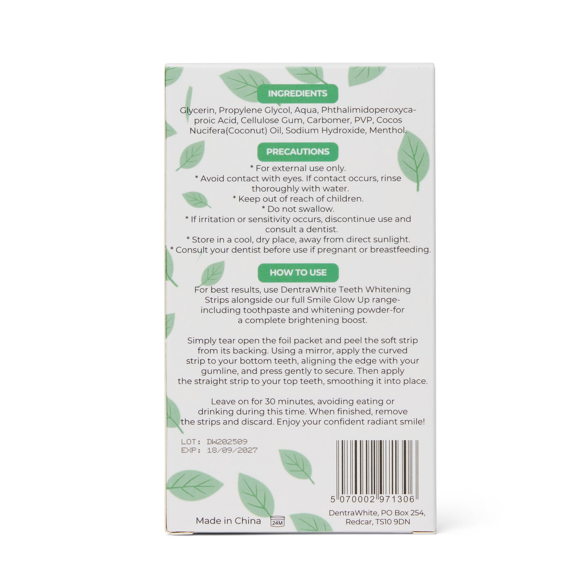 Strips: Glycerin, Propylene Glycol, Aqua, Phthalimidoperoxycaproic Acid (PAP), Cellulose Gum, Carbomer, PVP, Cocos Nucifera (Coconut) Oil, Sodium Hydroxide, Menthol
